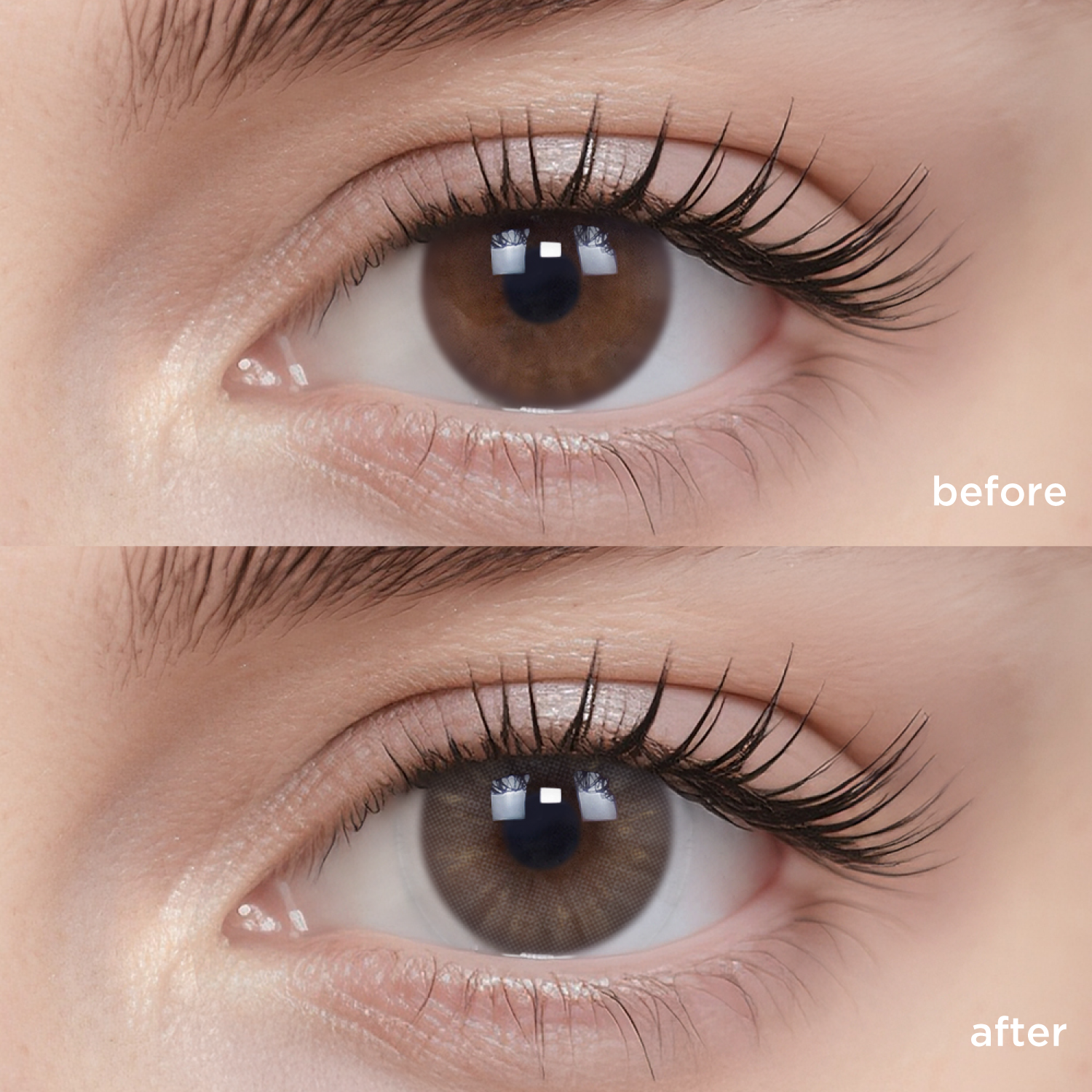 The actual wearing effect might vary mainly due to the difference in original eye color and iris pattern. Other factors such as lighting, camera filter, eye shape, etc., might cause differences as well.
