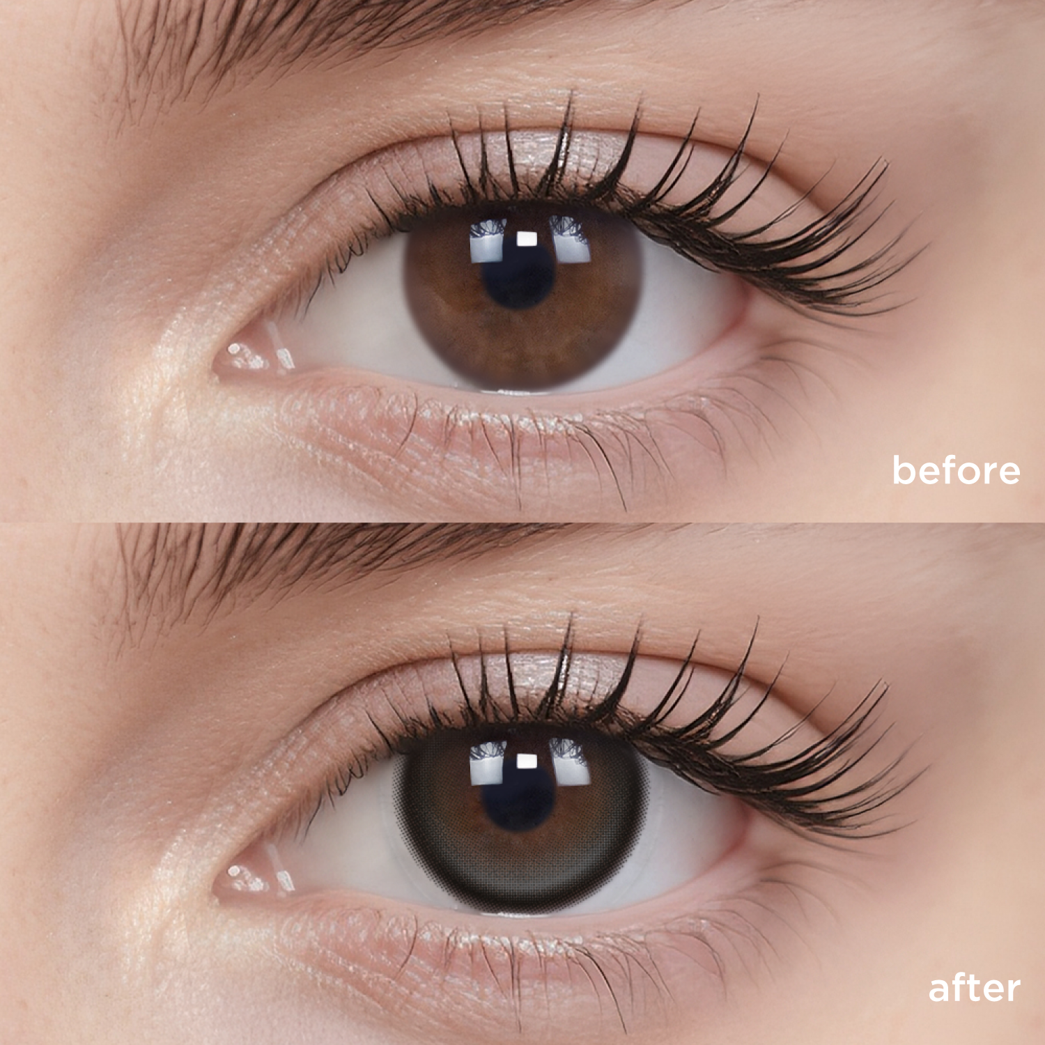The actual wearing effect might vary mainly due to the difference in original eye color and iris pattern. Other factors such as lighting, camera filter, eye shape, etc., might cause differences as well.