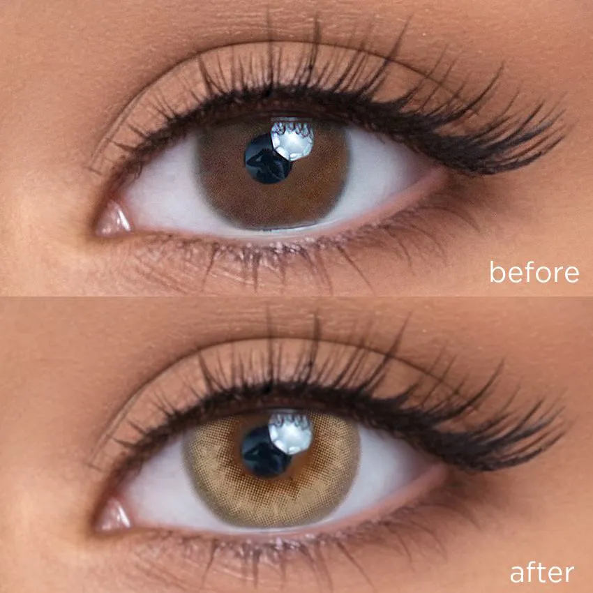 The actual wearing effect might vary mainly due to the difference in original eye color and iris pattern. Other factors such as lighting, camera filter, eye shape, etc., might cause differences as well.