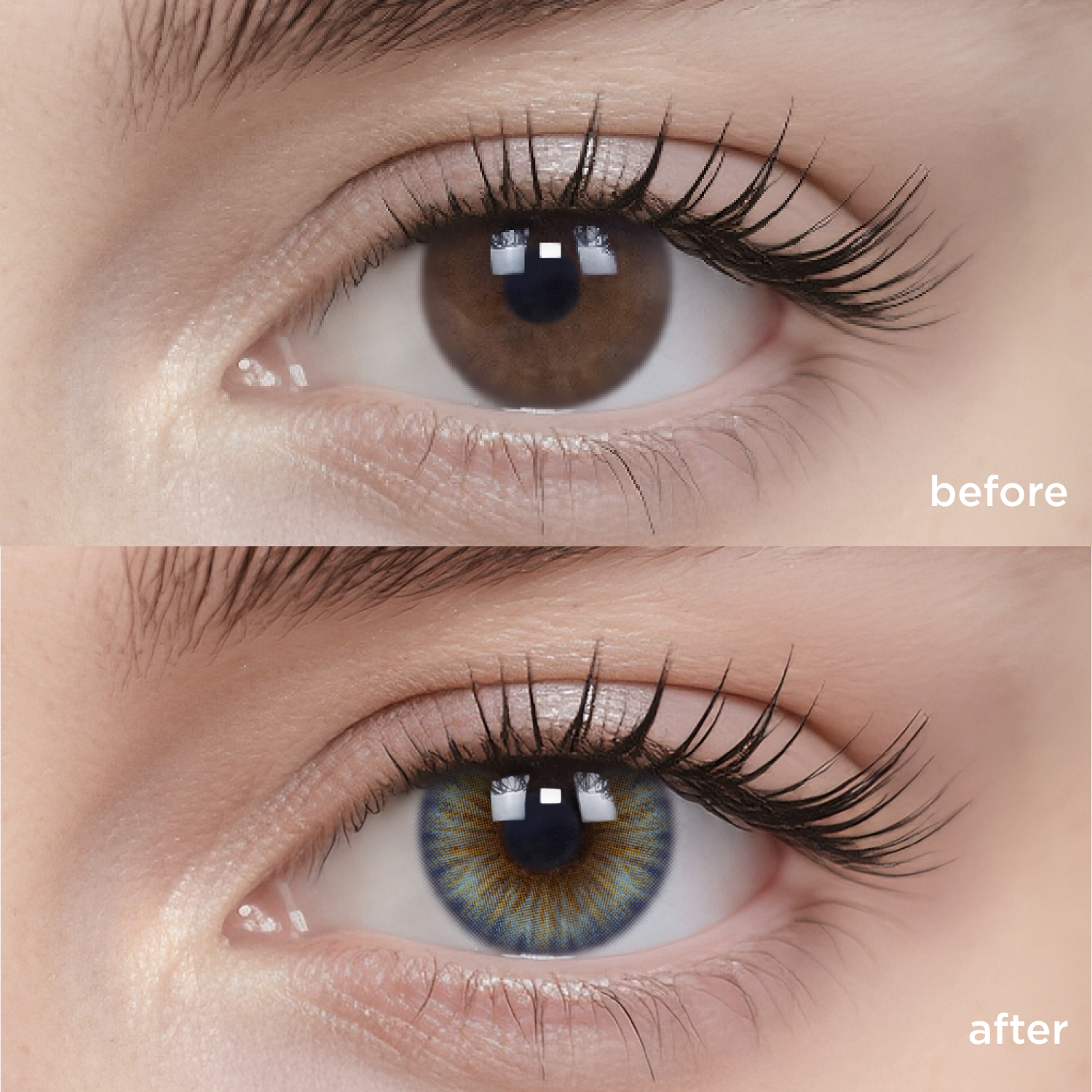 The actual wearing effect might vary mainly due to the difference in original eye color and iris pattern. Other factors such as lighting, camera filter, eye shape, etc., might cause differences as well.